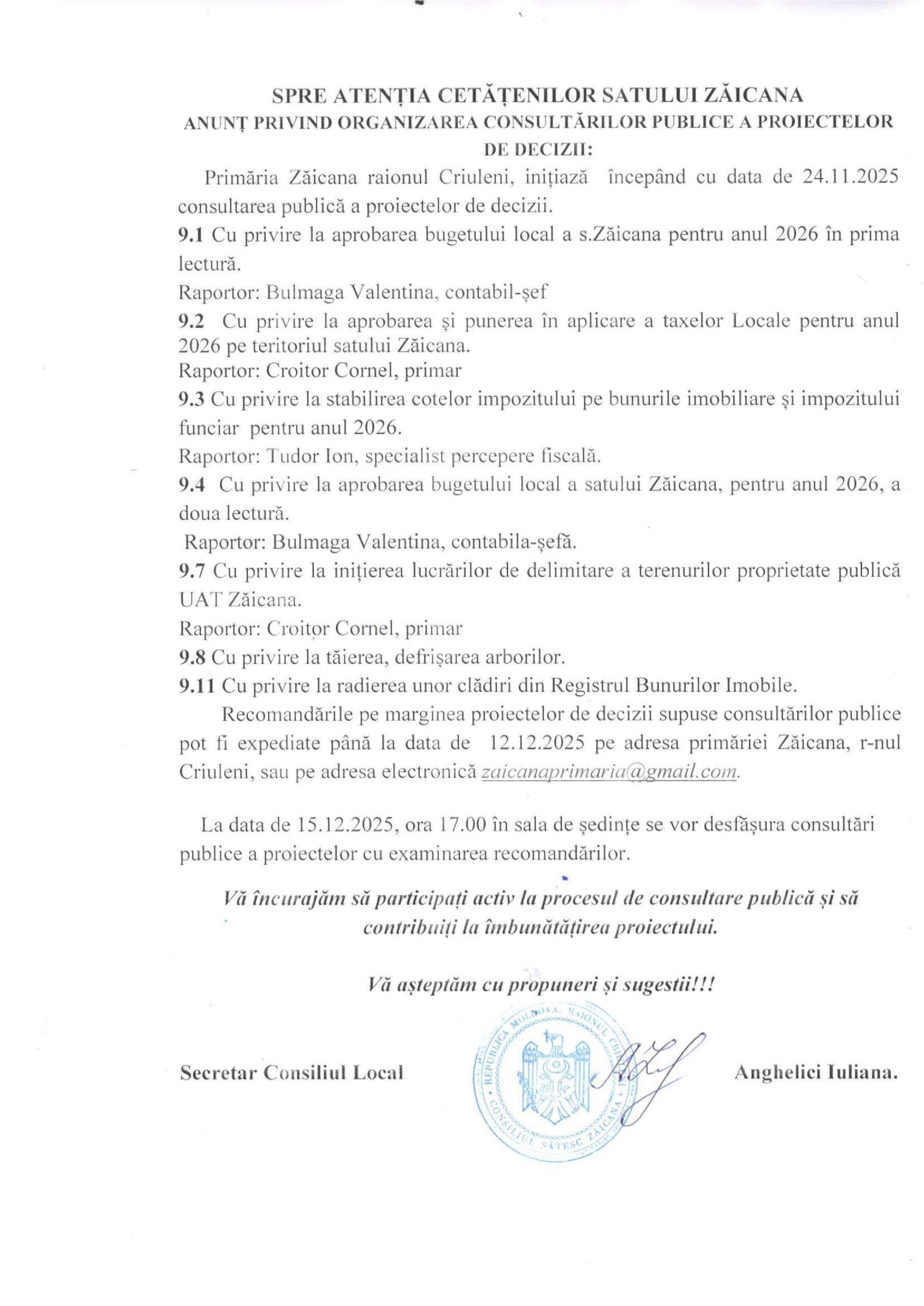 Anunț privind organizarea Consultărilor publice la data de 15.12.2025